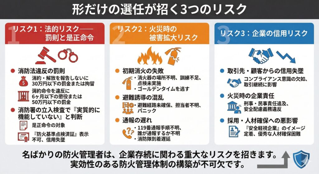 形だけの防火管理者選任は、以下の3つのリスクをもたらします。