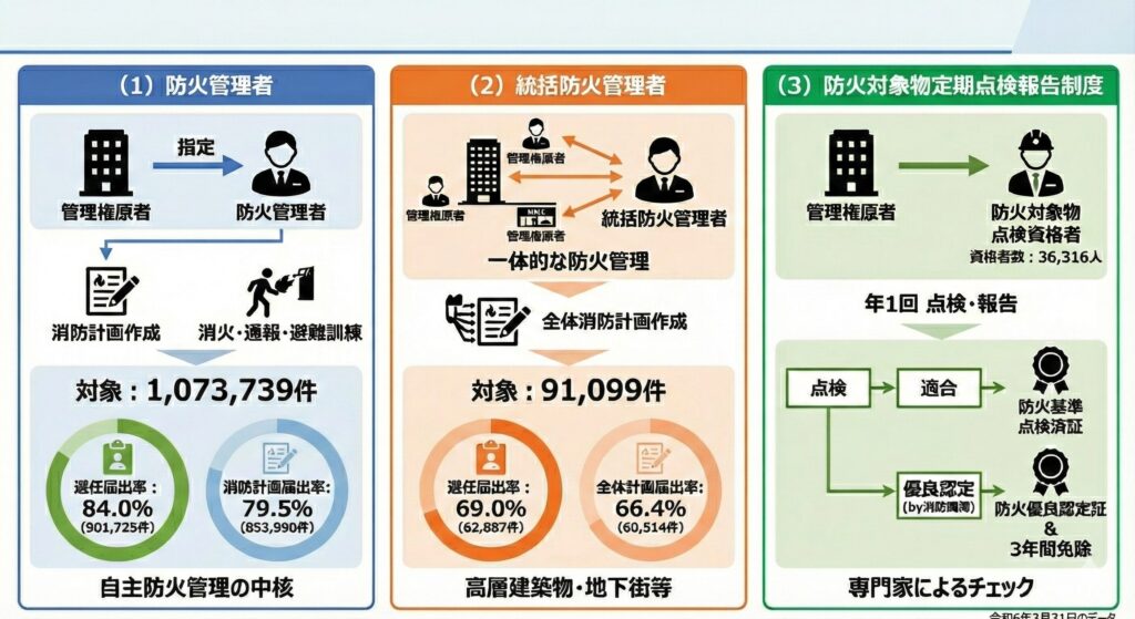 前述の通り、防火管理者の選任率は84.0%です。しかし、同じ消防白書のデータを詳しく見ると、別の事実が浮かび上がります。