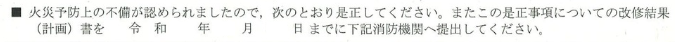 - 提出期限: 指摘された事項の是正を完了させ、その結果を消防署に報告【または改修結果(計画)書を提出】しなければならない期日です 。