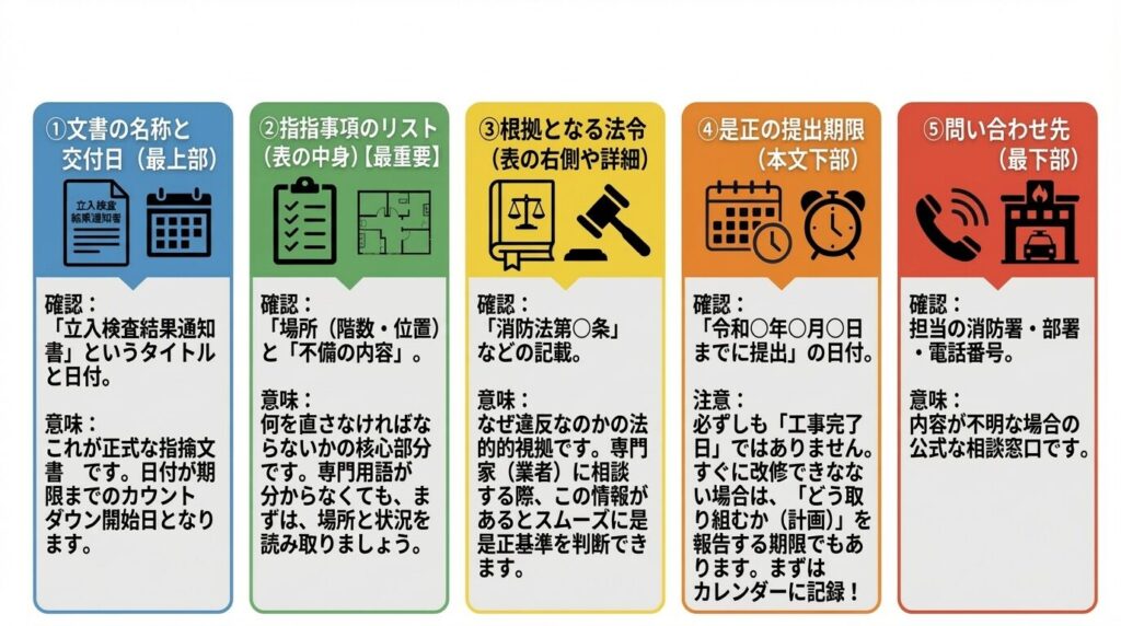 立入検査結果通知書を受け取ったら、「どこから読めばいいの?」「この専門用語は何?」と困惑されるかもしれません。ですが、通知書の中で特にあなたが対応を始める上で、必ず確認し、その意味を理解しておくべき重要な項目は限られています。