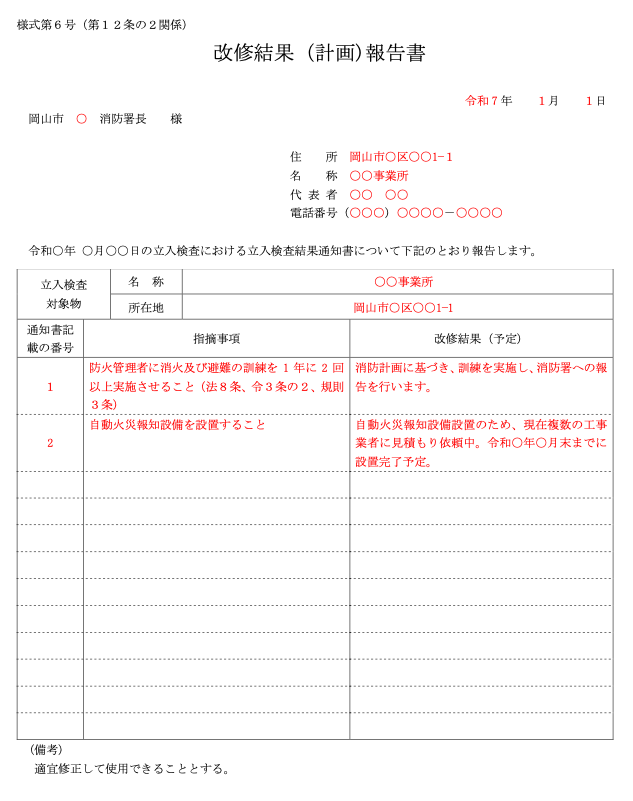 - 「改修結果(計画)報告書」は、立入検査結果通知書に記載されている提出期限までに、消防署に提出を完了させてください。