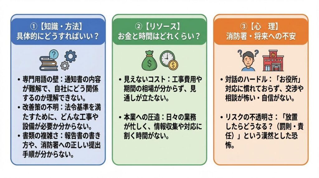 これらの悩みは、単に法令が難しいだけでなく、消防行政の特殊性や、消防署とのやり取りの不慣れさから生じるものです。