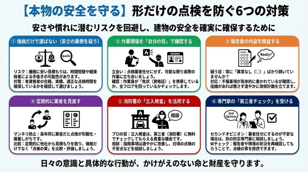 消防設備は、火災発生時に人命を守る最後の砦です。その消防設備が、形だけの点検によって機能しない状態になっていたら…考えるだけで恐ろしいことです。